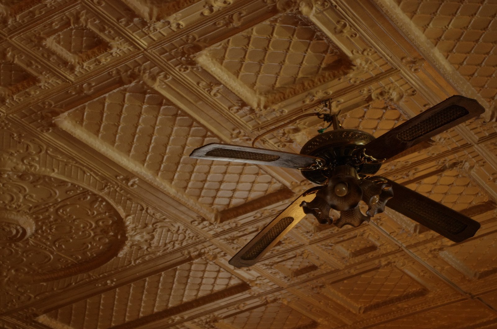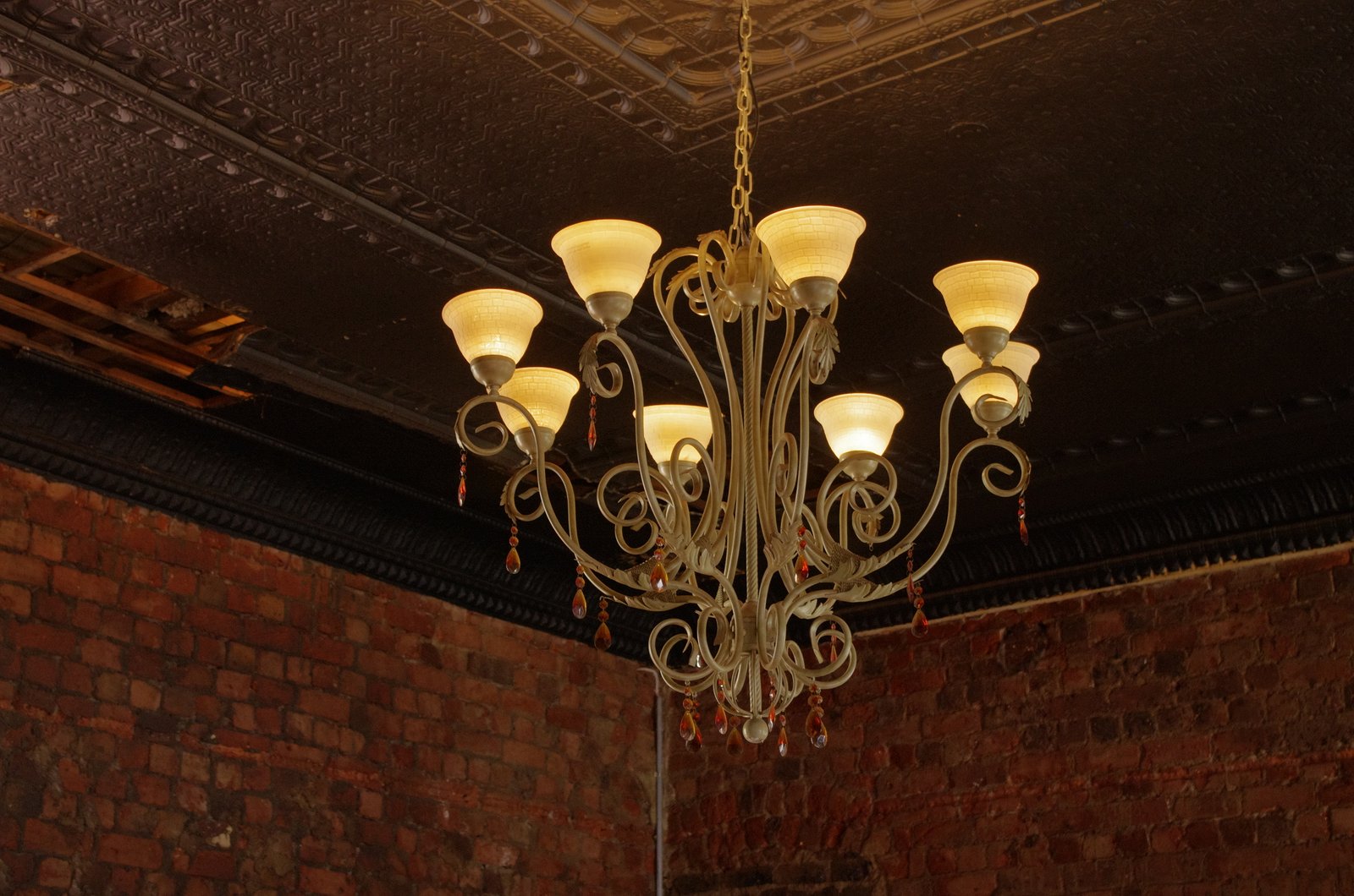 Pressed steel ceilings, bare brickwork and a stunning lamp…