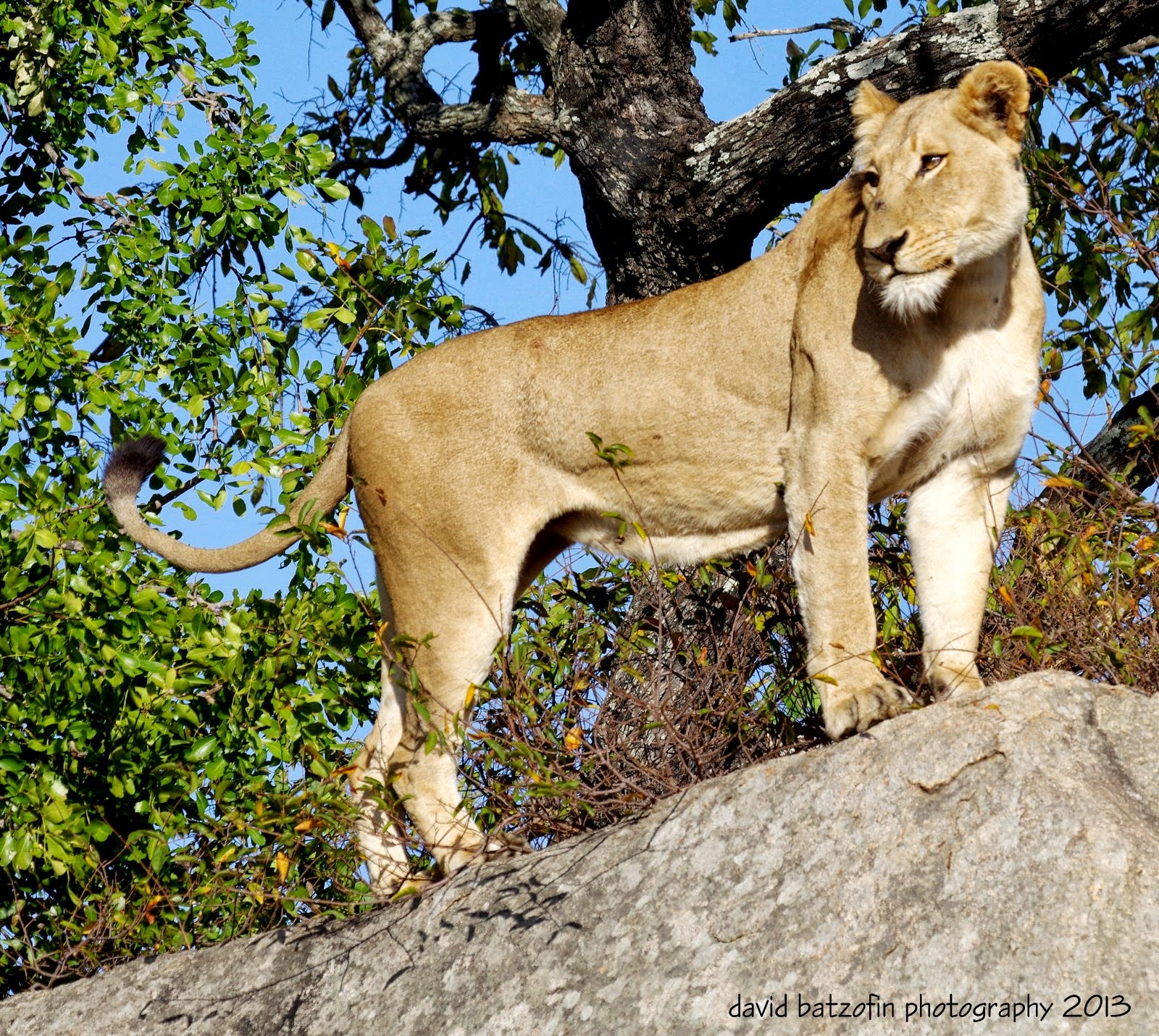 07h52: The lioness has now arrived on the rock,